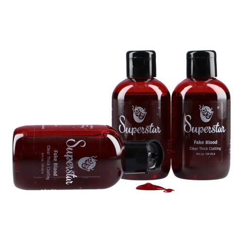 La Superstar Fake Blood Clear Thick es una sangre artificial hermosa y clara. Es bastante espesa y se mantiene bien en el lugar de aplicación sin manchar y se puede usar para hacer heridas con sangre. La sangre se coagula. Al combinar sangre clara y oscura, crea un resultado hermoso. Ideal para heridas y Halloween.