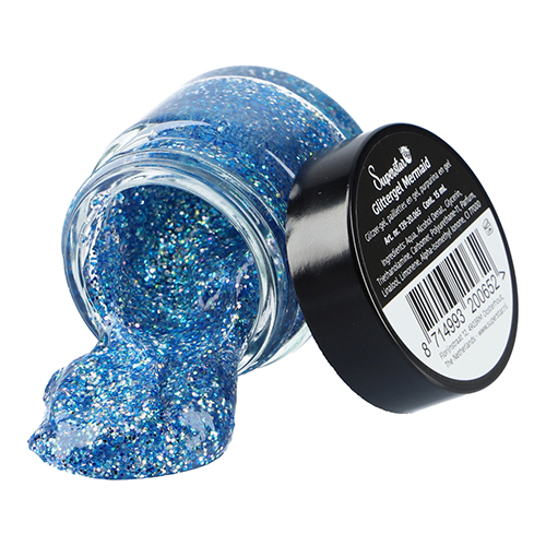 El glittergel contiene glitter de Polyethylene Terephthalate (3 hex) de calidad cosmética en una base de gel. El gel está diseñado para que también puedas aplicarlo sobre la Superstar Aqua Face- and Bodypaint sin que este lo disuelva. Además, el gel se seca rápidamente. Para un efecto súper brillante, puedes aplicar una capa adicional de purpurina suelta cuando el gel aún esté mojado.