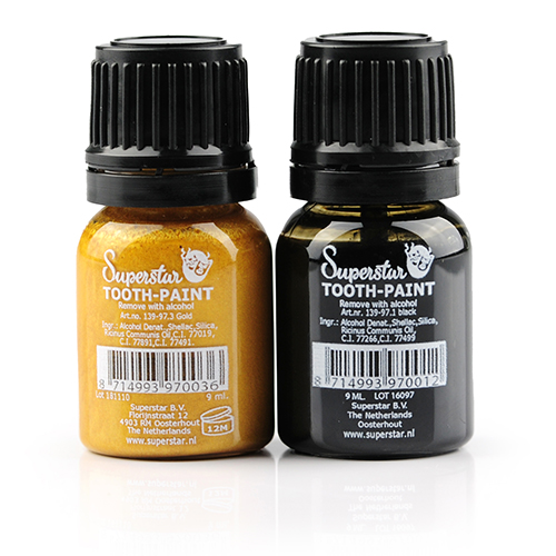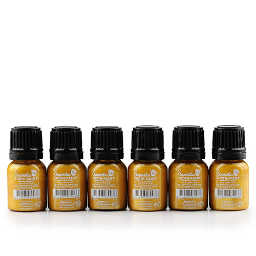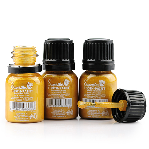 El Superstar Tooth-Paint Gold es un barniz con el que se pueden colorear los dientes en oro. Puede aplicar la laca con un pincel o un bastoncillo de algodón.