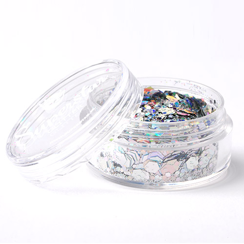 Entra en el colorido y brillante mundo de los Chunky glitter de Superstar. Nuestros brillos están hechos de 100% de tereftalato de polietileno en varios tamaños y son seguros para usar en la piel y el cabello. Para usar junto con el Superstar Glitterless Gel o glittergel.