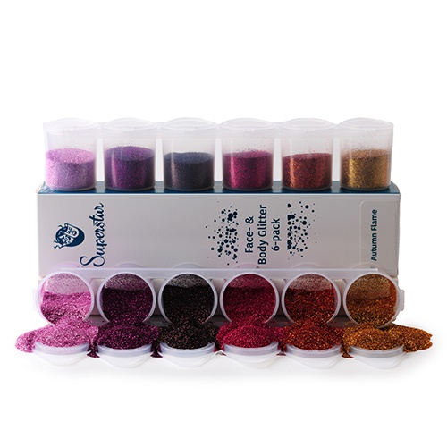 El paquete de 6 colores Autumn Flame Fine Glitter Mix es imprescindible para tu kit de maquillaje. Puede agregar acentos brillantes de una manera rápida y fácil. La purpurina es adecuado tanto para la piel como para el cabello. La purpurina del Fine Glitter Mix se puede aplicar directamente o en combinación con el Glitterless gel de Superstar (art. n.º 139-20.001). Ideal para hacer tatuajes con purpurina. Utilice el Superstar Body Glue (art. No. 139-92.1).
