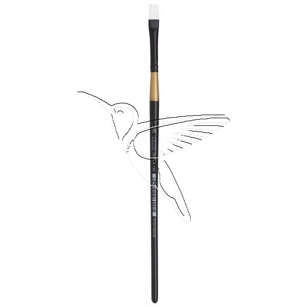 Pincel plano 1/4. Pincel de pelo sintético blanco, con una abrazadera sin costuras de color plateado y un mango corto lacado en negro.