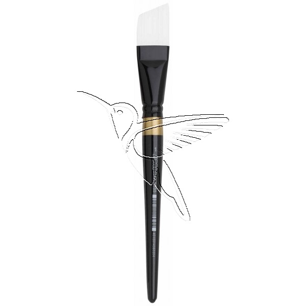 Pincel plano cortado nº 1, con pelo sintético blanco, con una abrazadera sin costuras de color plateado y un mango corto lacado en negro.