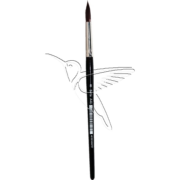 Pincel redondo nº 8, con pelo sintético burdeos, con una abrazadera transparente de color plateado y un mango corto lacado en negro.