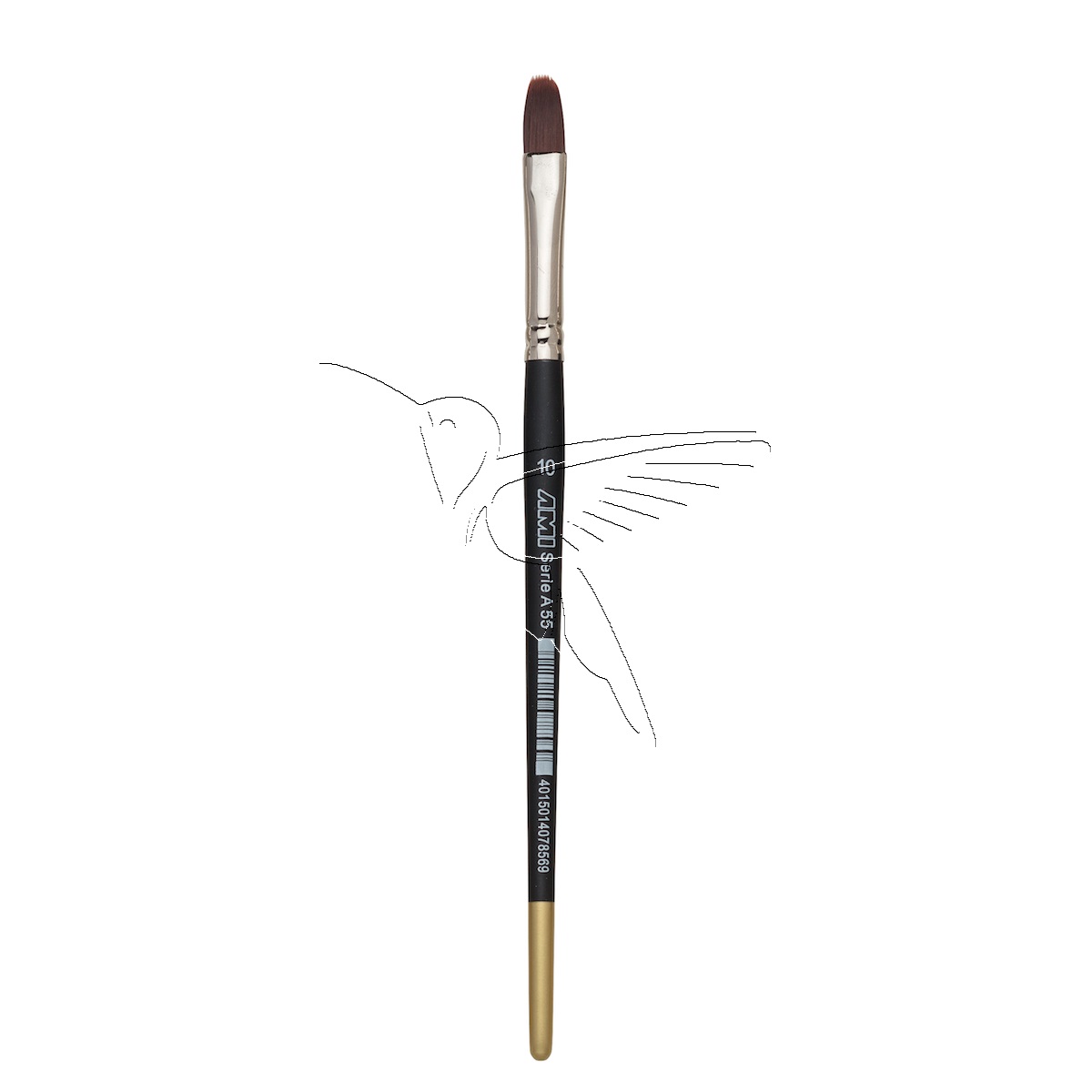 Pincel lengua de gato nº 10, con pelo sintético burdeos, con una abrazadera transparente de color plateado y un mango corto lacado en negro.